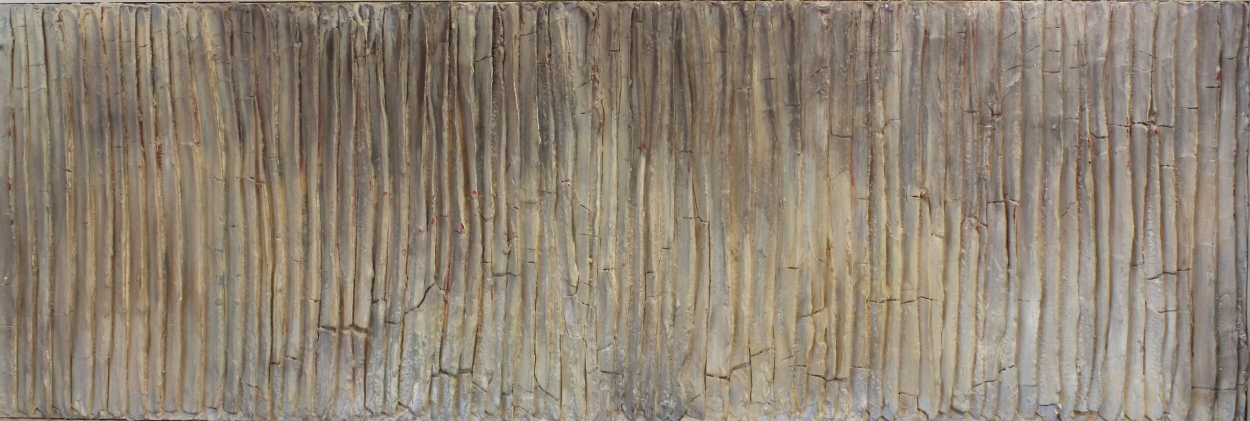 Tireless layering, texturing, scraping back and building up of pigment, texture, and canvas surface—very close in candor to the ash accumulation and flame marks of the anagama on the skin of clay.